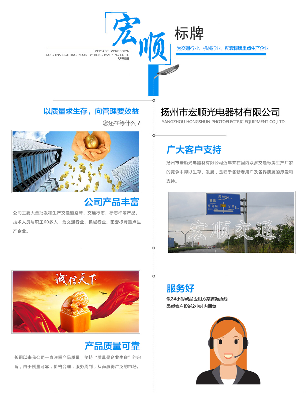 揚州市宏順光電器材有限公司近年來在國內眾多交通標牌生產廠家的競爭中得以生存、發展,是歸于各新老用戶及各界朋友的厚愛和支持。我們全體員工向你們致以誠摯的感謝。 為使我們共同步入新世紀,提高我們的產品質量與服務希望對我們提出寶貴的意見,使我們不斷改進、創新。 我們將和過去一樣,視今天的質量為明天的市場。為您奉獻滿意的各種精品,為美化我們的交通事業做出貢獻。 公司主要大量批發和生產道路交通標志牌、道路指示牌、交通標志牌、指路牌、反光標志牌等產品。技術人員與職工60多人,為交通行業、機械行業、配套標牌重點生產企業。 長期以來我公司一直注重產品質量,堅持“質量是企業生命”的宗旨,由于質量可靠,價格合理,服務周到,從而贏得廣泛的市場,近年來隨著交通事業的開發和研究,傾聽用戶的意見,使得我們在市場競爭中不斷發展壯大。 我們本著“質量可靠、信譽優先、用戶至上”的宗旨,“以質量求生存,向管理要效益”的信條,竭誠為... ...【查看更多】